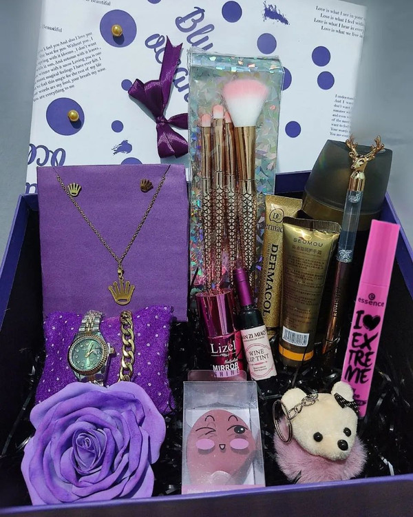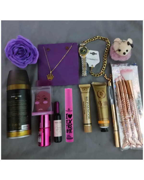 پک کادویی دخترانه شامل ۱.ساعت رولکس تقویم دار استیل ۲.دستبند طلایی استیل ۳.گرنبند طرح رولکس ۴. گوشواره طرح رولکس ۵. ریمل اسنس ۶. خط چشم ماژیکی ۷. اسپری بدن زنانه ۸ کرم گریم درماکول ۹. کرم عصاره اسب ۱۰. بالم لب شامپاینی ۱۱. پد اشکی ۱۲.جاسوئیچی ۱۳. براش چهار تایی ۱۴. لاک آینه ایی صورتی ۱۵. گل تزئینی ۱۶. پوشال ۱۷. جعبه کادویی